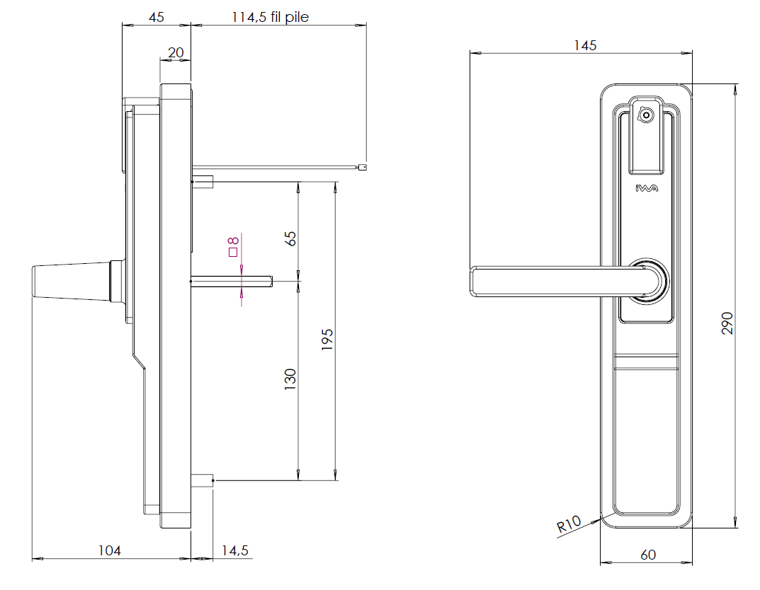 - Carré de 7mm avec fourreau de 8 mm (mise à longueur suivant porte)